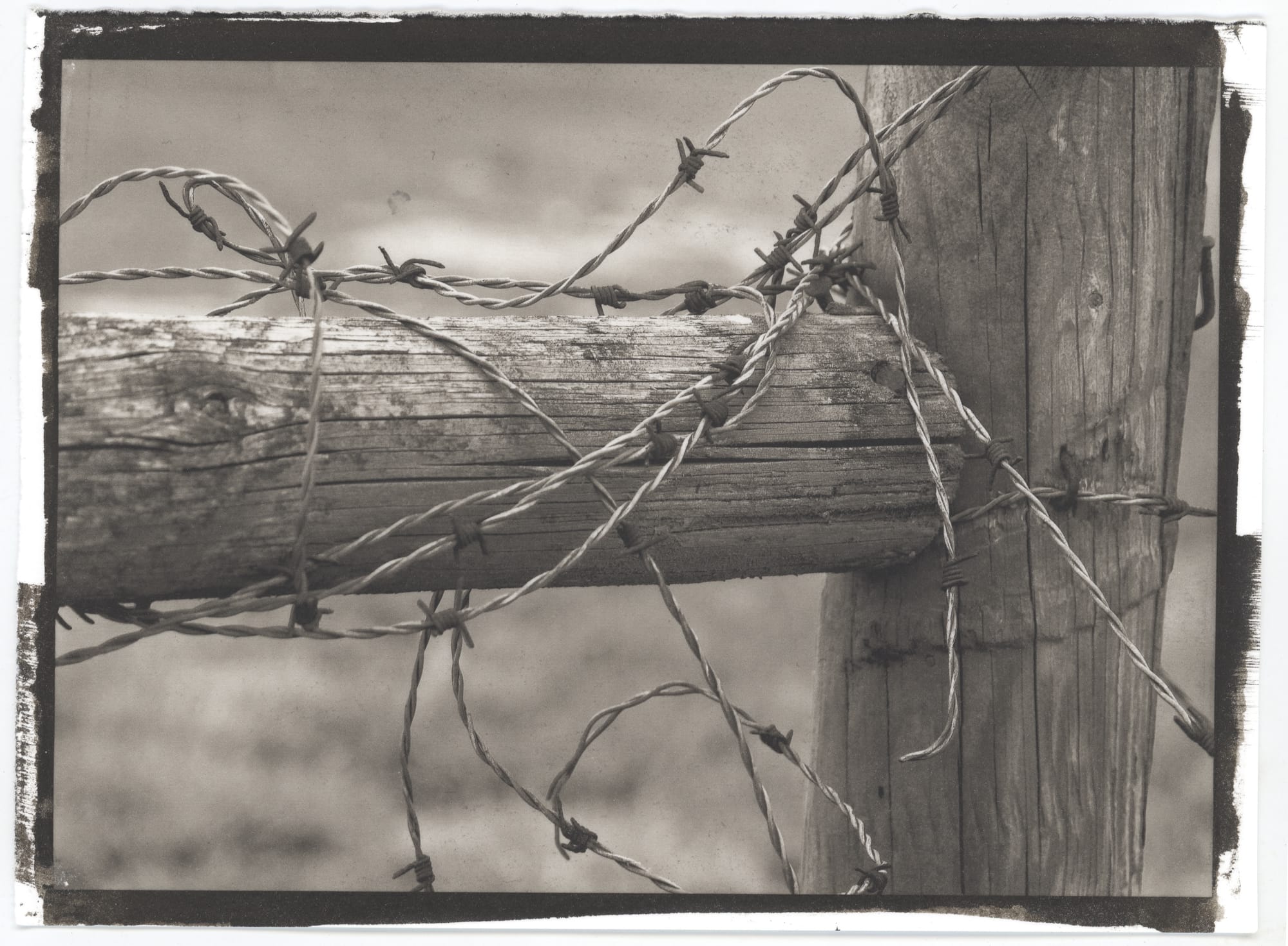 #25P-013. Fence and barbed wire. Palladium/Platinum print on Hahnemuhle Platinum Rag paper. Print size: 5x7, paper size: 5.5x7.5. Printed 8/8/25 in Staunton, VirginiaFence and barbed wire